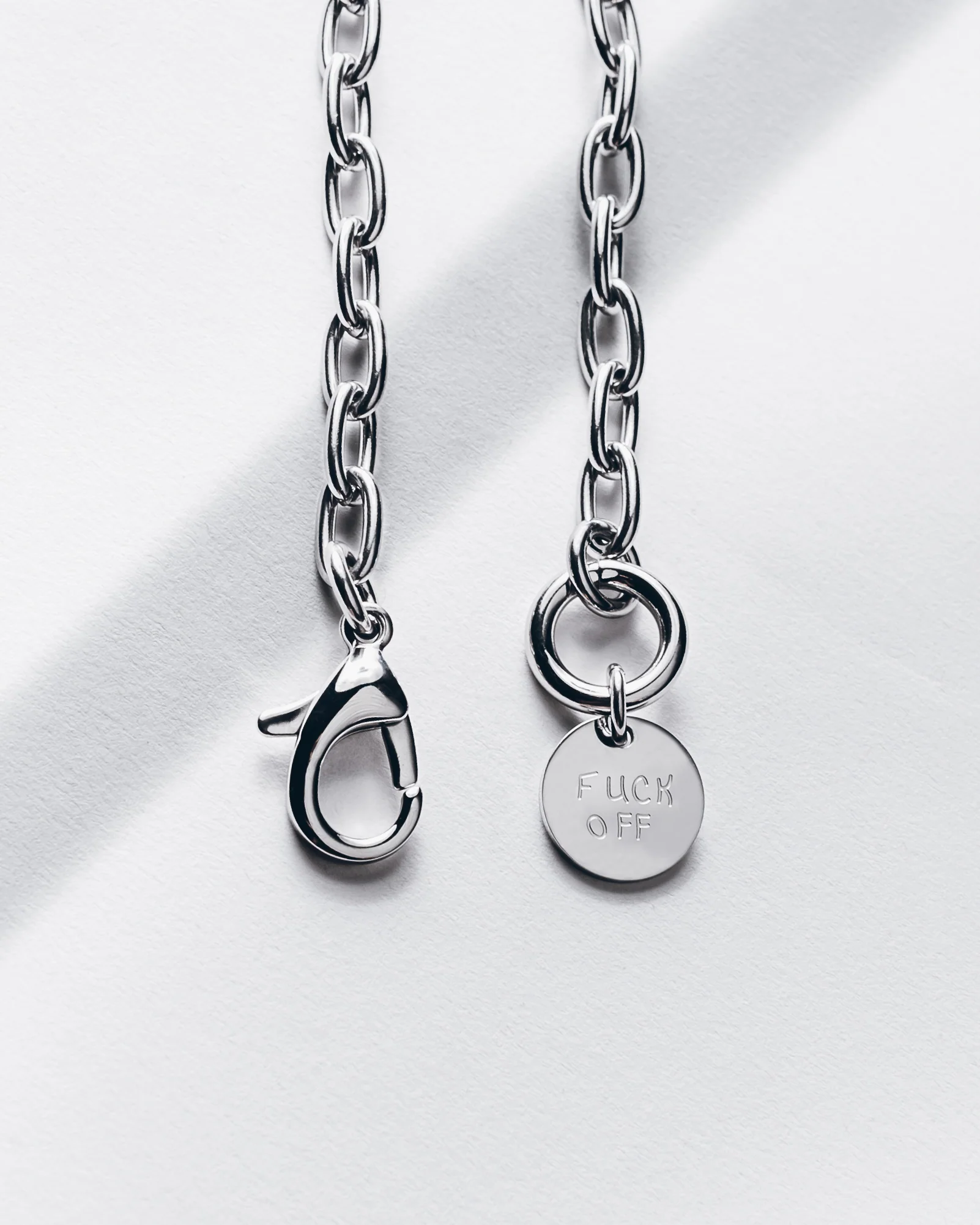 Embodying the rebellious and free spirit of MIKUTA, The F* Off Necklace is a not-so-subtle reminder to reject negative outside opinions, fear of failure, or anything else standing in your way. Crafted in chunky stainless steel with a lobster claw clasp and "F* Off" pendant