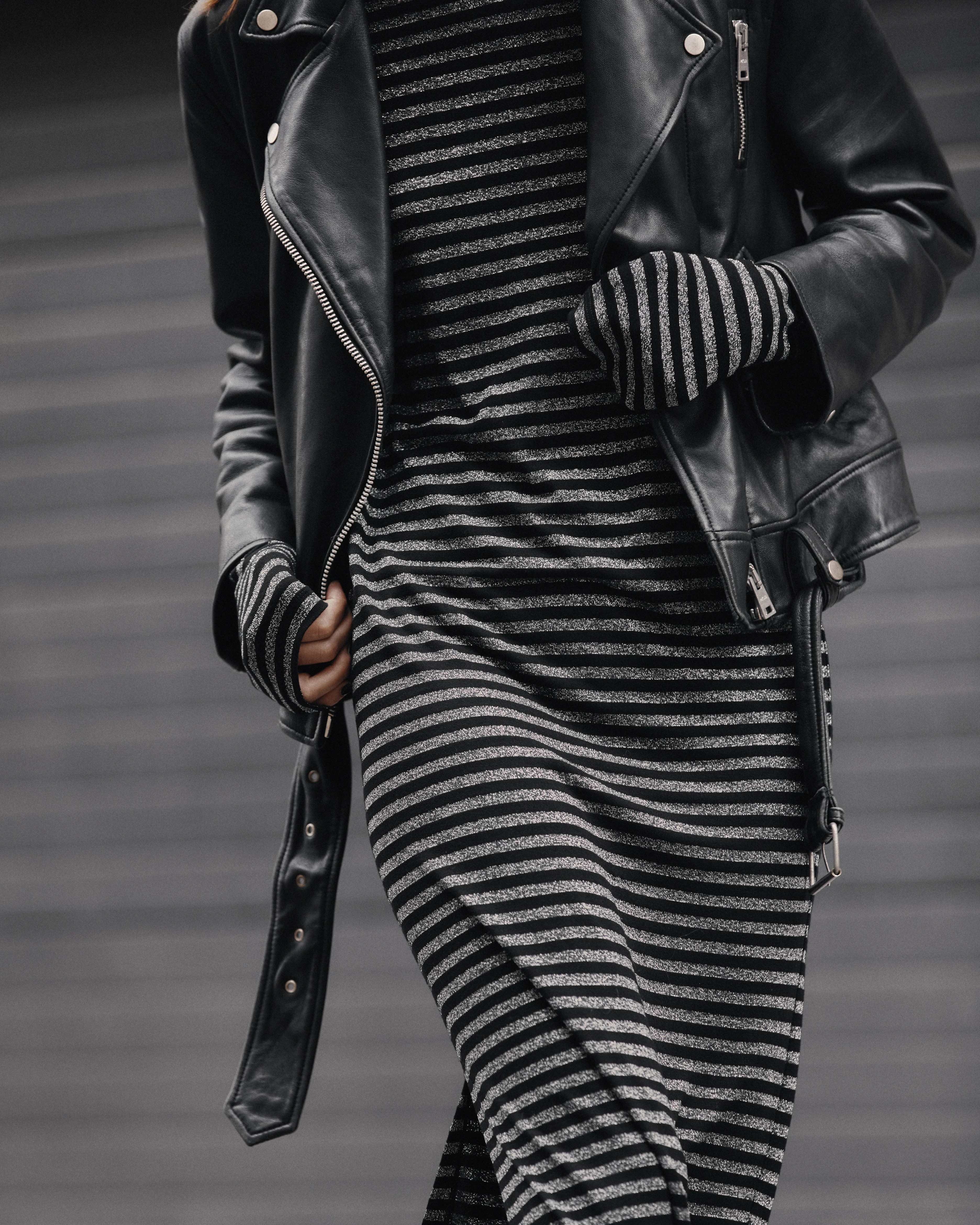 Striped long-sleeved dress in black and silver with extra long sleeves and a slit on the side.